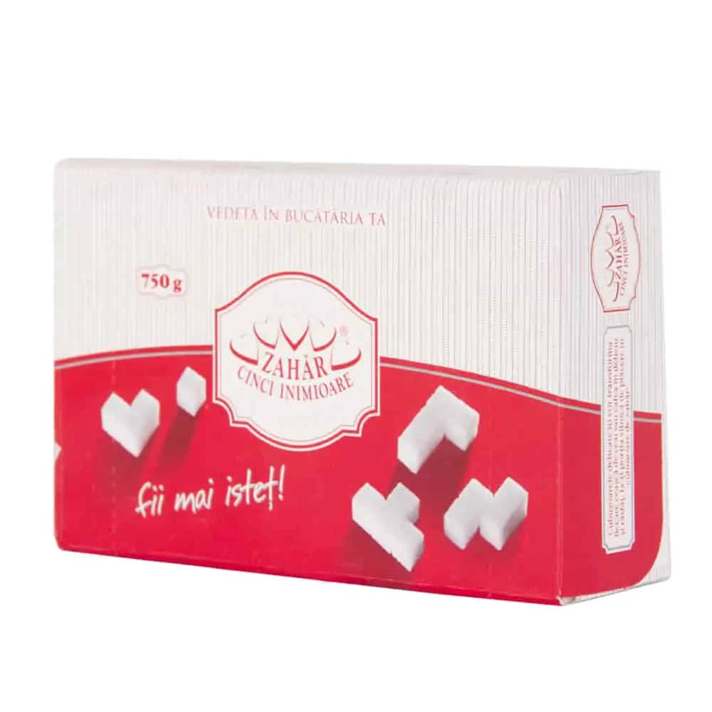 Zahăr Cinci inimioare în cuburi 750 g. Zahăr alb sub formă de cuburi ușor de folosit. Potrivit pentru servire porționată la ceai și cafea.